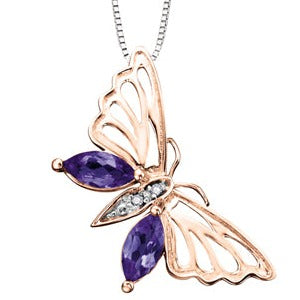 10K Rose Gold Amethyst Butterfly Necklace featuring two marquise amethyst plus .005ct diamond