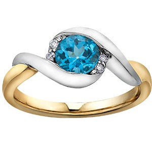 10K Yellow & White Gold Blue Topaz Ring featuring 6mm blue topaz plus 4 diamonds of .05ct total diamond weight