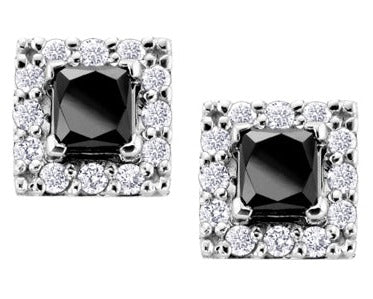 10K White Gold Earrings featuring 2 Black Princess Cut Diamonds of .75ct total weight with removable diamond jackets containing 24 side diamonds of .25ct total diamond weight.
