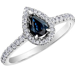 10K White Gold Diamond Sapphire Ring featuring a pear shaped sapphire and 40 diamonds of .27ct total diamond weight