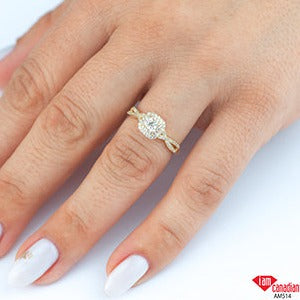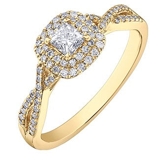 10K Yellow Gold Diamond Ring featuring .24ct princess cut Canadian diamond plus a double halo & side diamonds of .27ct total diamond weight