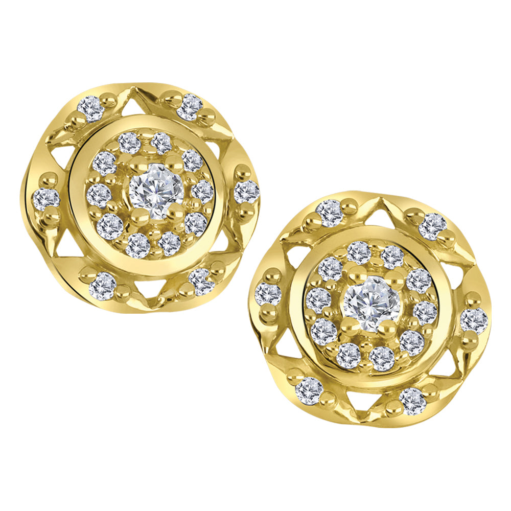 10K Yellow Gold Diamond Halo Earrings featuring 2 Canadian diamonds of .05ct total weight plus 32 side diamonds of .06ct total diamond weight