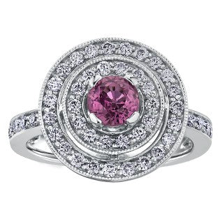 14K White Gold Pink Sapphire & Diamond Double Halo Ring featuring one pink sapphire 5.5mm in diameter plus 57 diamonds of .60ct total diamond weight