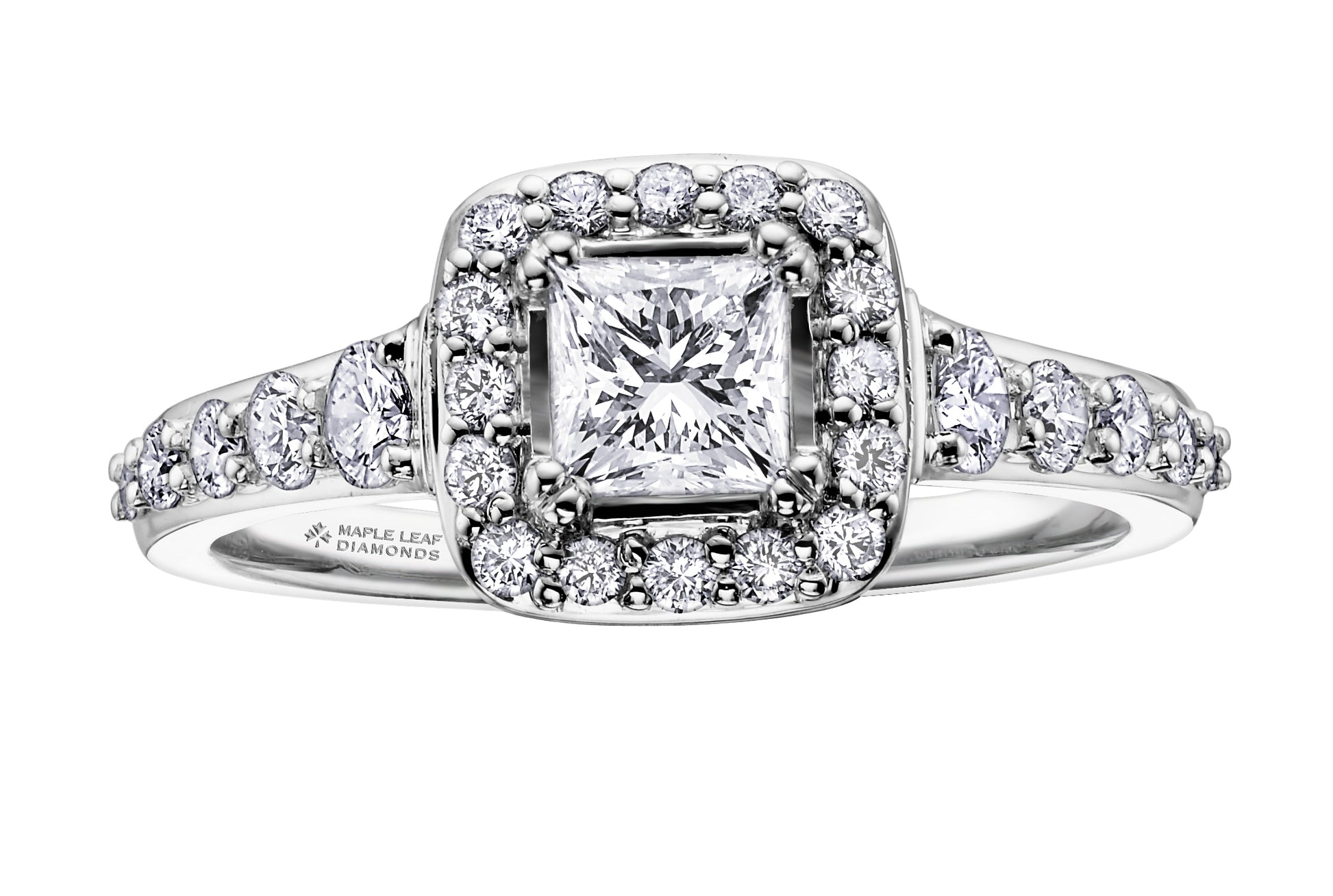 18K White Gold Palladium Diamond Ring featuring .40ct Maple Leaf Diamond plus 24 side diamonds of .40ct total weight