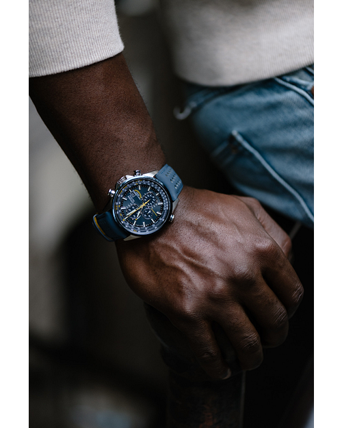 The Blue Angels World Chronograph A-T comes equipped with atomic clock synchronization for superior accuracy. This perpetual calendar chronograph is radio-controlled and shows time in 26 time zones. Featured in a stainless steel case with a blue polyurethane coated leather strap, this timepiece additionaly features a 1/20-second chronograph that measures up to 60 minutes, 12/24-hour time, a power reserve indicator, a pilot's rotating slide rule dial ring and an anti-reflective sapphire crystal. The official Blue Angels insignia appears on the watch caseback. Water resistant up to 200 metres.
