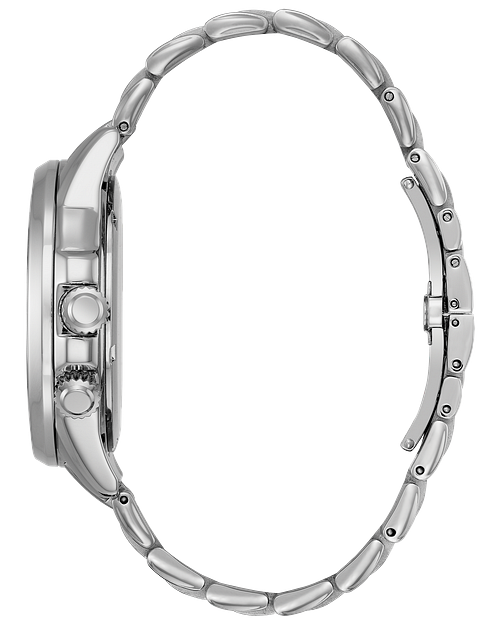 The CITIZEN® Calendrier reflects a timeless sophistication featuring 12/24-hour time, world time in 24 time zones and day/date. Shown in a stainless steel case and bracelet with a blue dial.