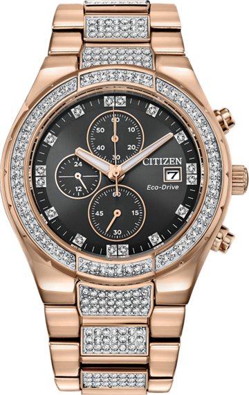 Bring sophistication to your day with the CITIZEN® Crystal. This timeless chronograph watch features 12/24-hour time and is shown in a rose gold-tone stainless steel case and bracelet adorned with crystals with a black dial. Featuring our Eco-Drive technology – powered by light, any light. Never needs a battery.