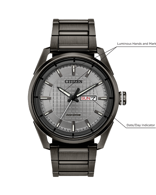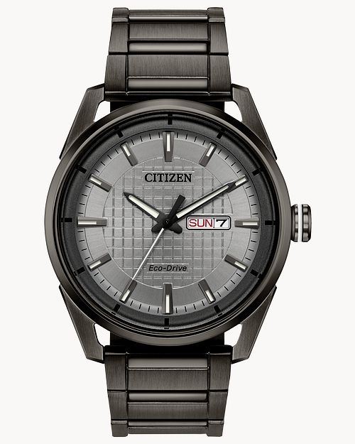 The CTO from CITIZEN®'s DRIVE Collection. A collection of watches with a classically modern design. Shown here in a grey ion plated stainless steel with a grey dial and day/date. Featuring our Eco-Drive technology – powered by light, any light. Never needs a battery.