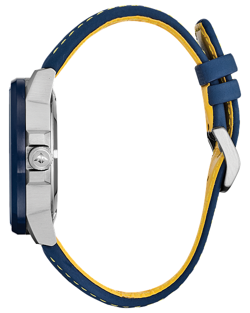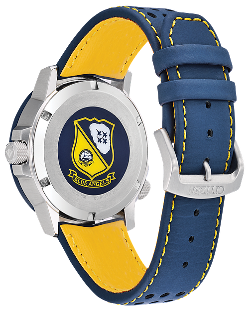 The Blue Angels are the Navy's elite flight demonstration squadron renowned for their precision and grace showcased in each of their flight maneuvers. This precision and grace is exhibited in the CITIZEN Blue Angels Nighthawk seen here with a navy blue ion plated stainless steel case, navy blue leather strap, and navy blue dial with bright yellow accents. It features 12/14-hour time and a pilots rotating slide ring. Featuring our Eco-Drive technology – powered by light, any light. Never needs a battery.