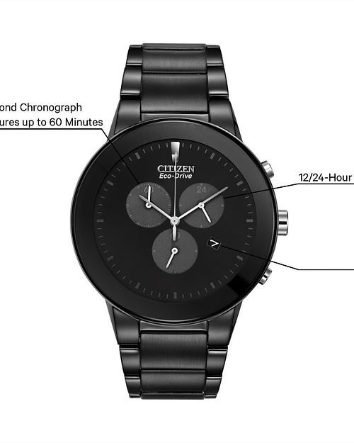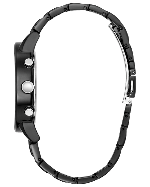 Axiom's refined yet sleek design offers a day-to-night fashion option for the trendsetter. This sharp chronograph is featured in black ion plated stainless steel with a black dial and stainless steel accents and the intriguing feature of edge-to-edge glass.