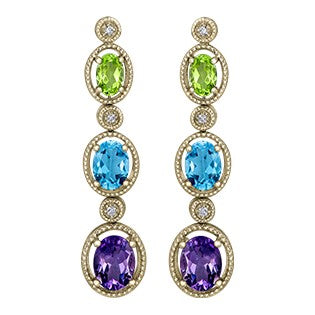 10K Yellow Gold Mixed Gemstone Earrings featuring genuine peridot, blue topaz, amethyst plus 6 diamonds of .06ct total diamond weight