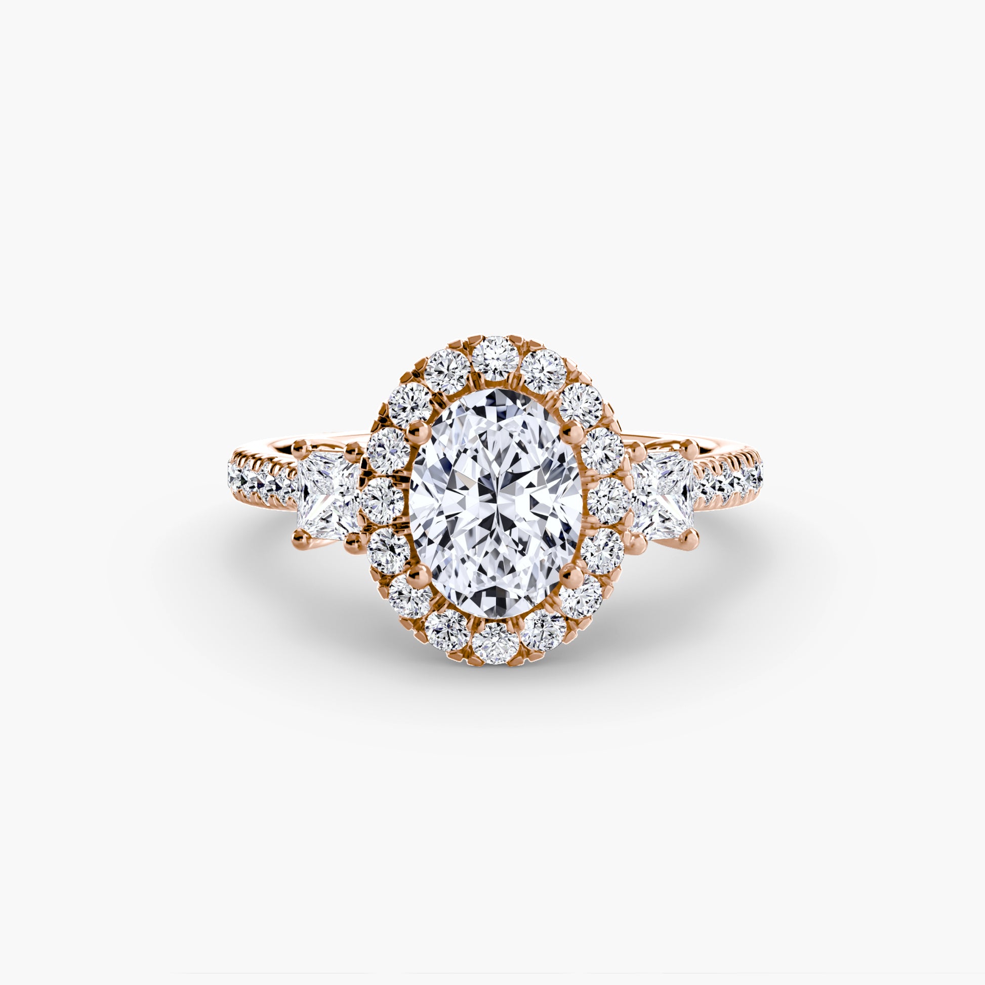 A unique take on the classic three-stone ring, this design is enhanced with a radiant halo for amplified brilliance and symbolism. Timeless with a modern twist.